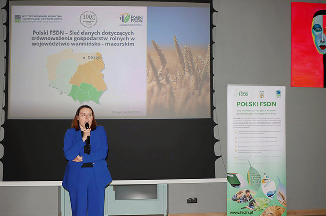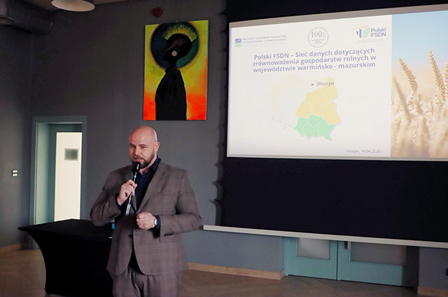 W dniu 14 kwietnia 2026 r. w Olsztynie odbyło się seminarium pt. „Polski FSDN – Sieć Danych Dotyczących Poziomu Zrównoważenia Gospodarstw Rolnych w województwie warmińsko‑mazurskim”, zorganizowane przez Warmińsko‑Mazurski Ośrodek Doradztwa Rolniczego z siedzibą w Olsztynie. W wydarzeniu uczestniczyli przedstawiciele kierownictwa W‑MODR, doradcy ds. Polskiego FSDN z regionu oraz reprezentanci Polskiego FSDN z Zakładu Rachunkowości Gospodarstw Rolnych IERiGŻ‑PIB.